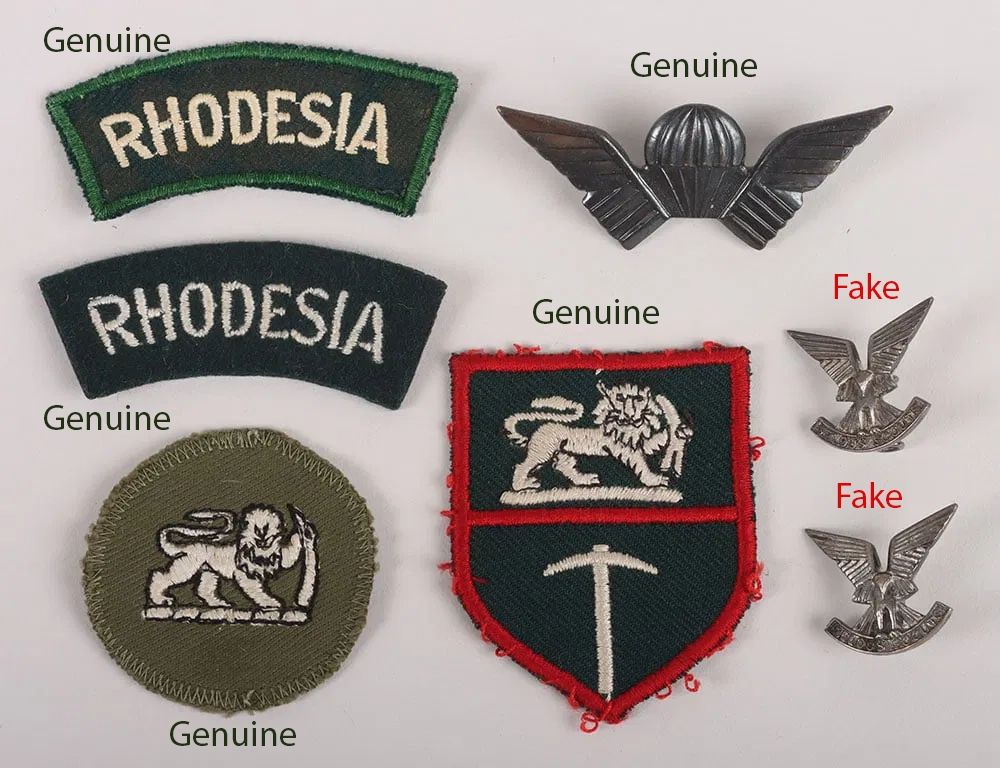 Listed by C & T Auctioneers and Valuers in December 2024. The Selous Scouts collar badges on the right hand side are fake. The third photo is of genuine collar badges.