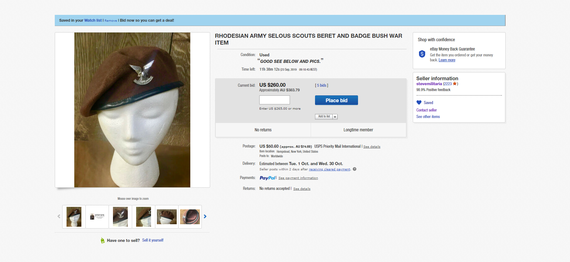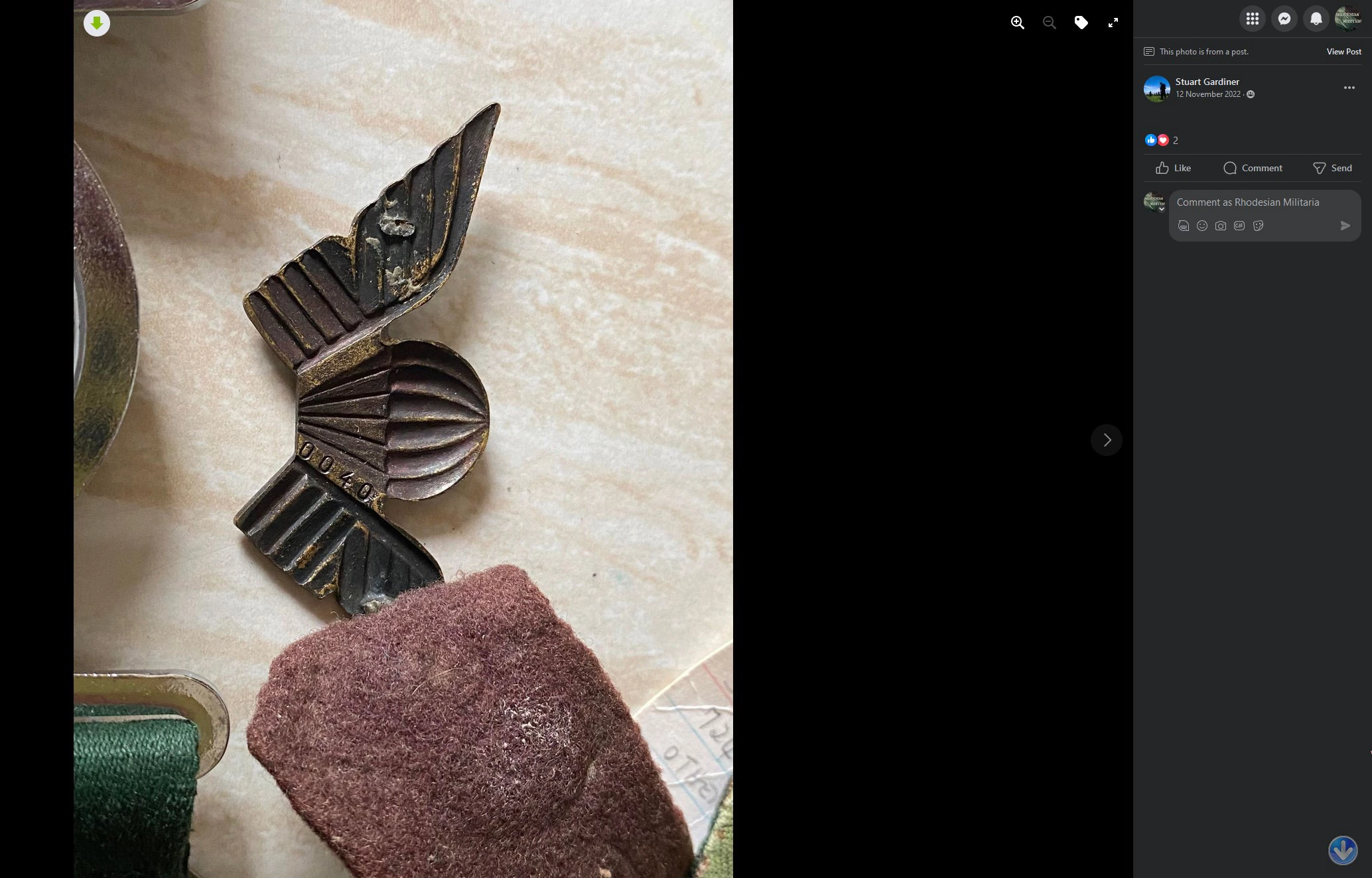Listed by grayman077 on eBay around June 2019 as a beret badge belonging to Sgt Clive Mason’s beret. Clive was a former Rhodesian SAS trooper and was a Selous Scout sniper when he was shot dead on 15 Mar 1977.