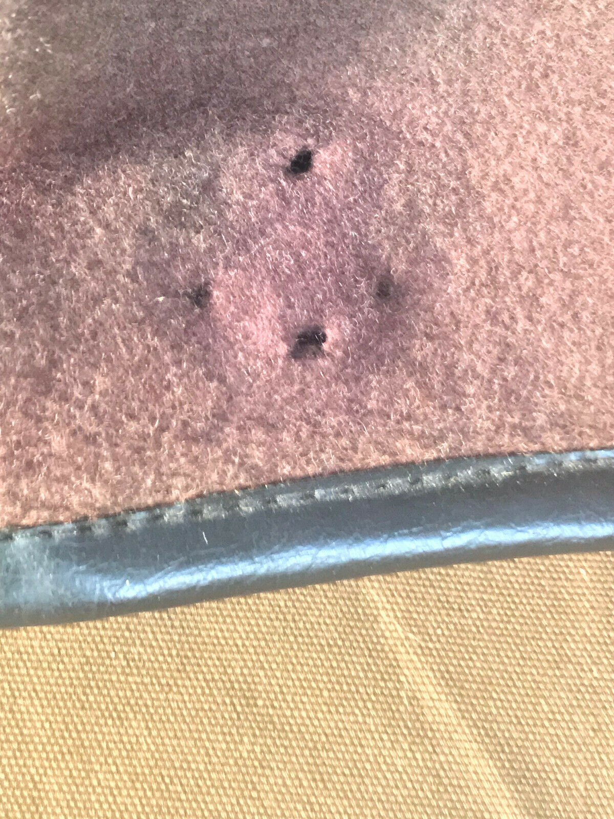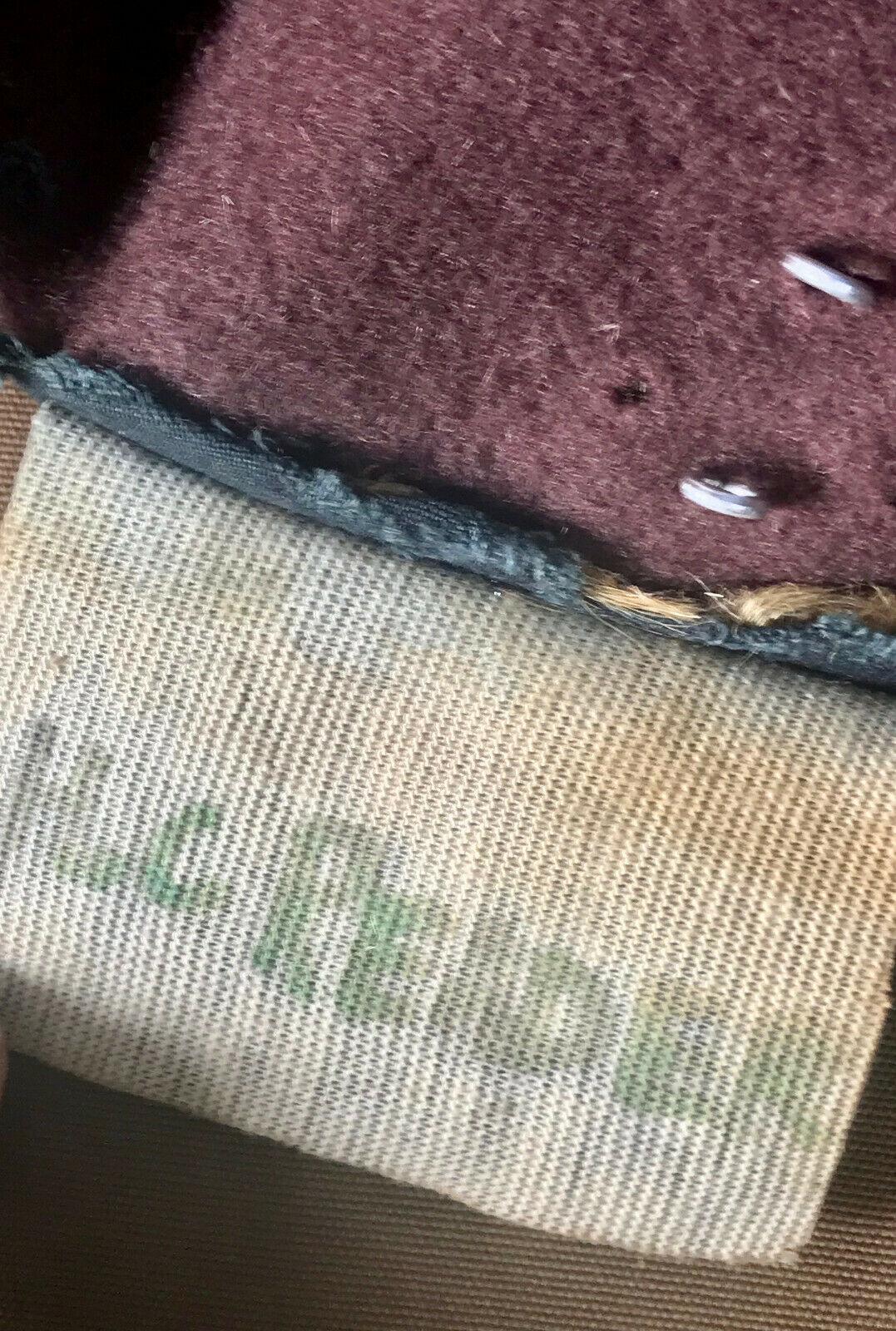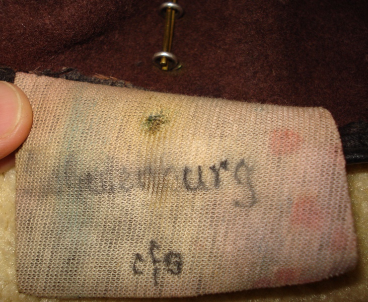 The beret was in terrible condition, featuring a tear at the front that had been stitched up and significant moth damage. The officer’s beret badge was a fake. The cover for the badge’s lugs had the name Schulenburg written on it, along with his initials.