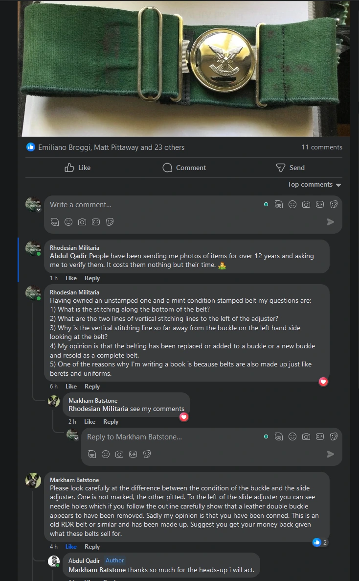 This ‘Selous Scouts stable belt was sold by Stuart Gardiner to someone I knew who then posted it on a Facebook group.