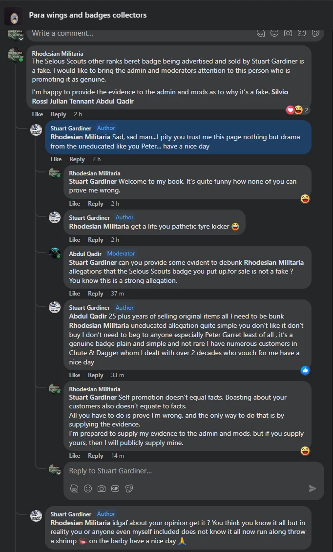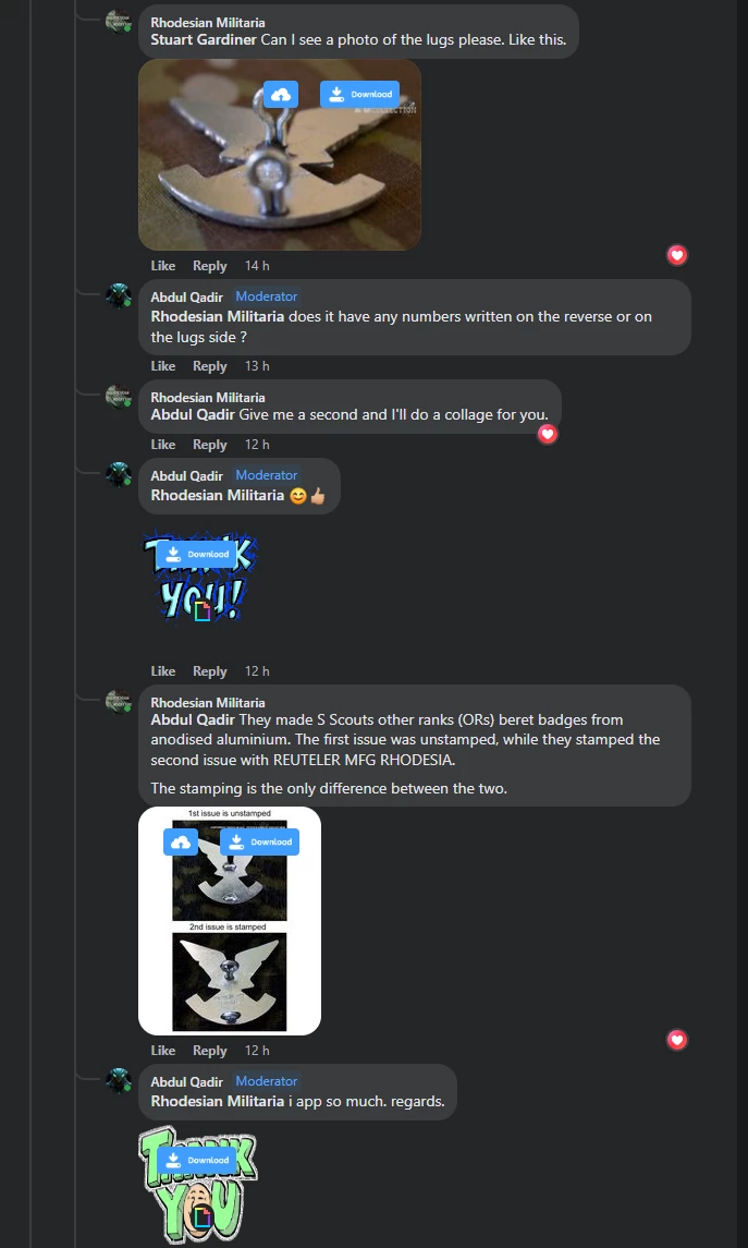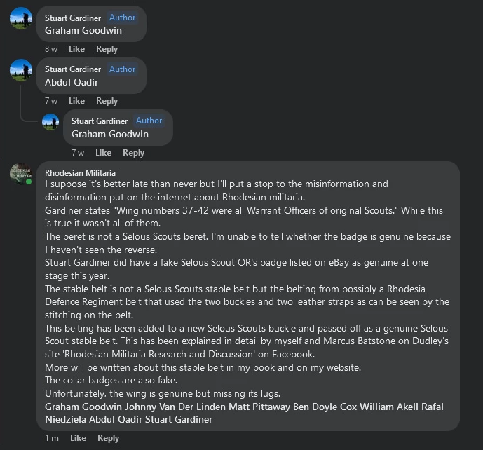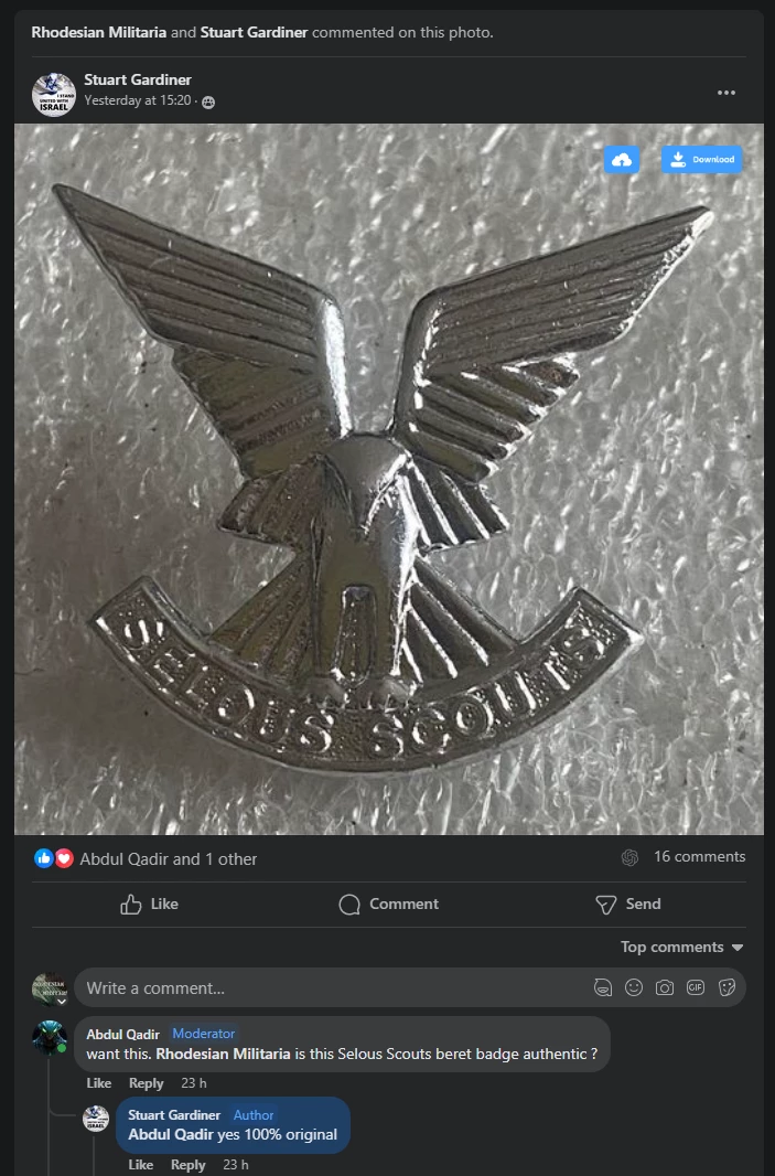 On the 24th October 2023 Stuart Gardiner (aka londoncollectables2015) displayed a Selous Scouts beret badge for other ranks on the group Para Wings and Collectors on Facebook. Abdul Qadir a moderator on the group asked me if it was genuine.