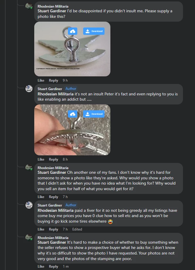 I asked him if I could see the lugs on the badge and uploaded a photo showing him how I’d like the lugs shown. He ignored me and then when I asked him again he started insulting me.