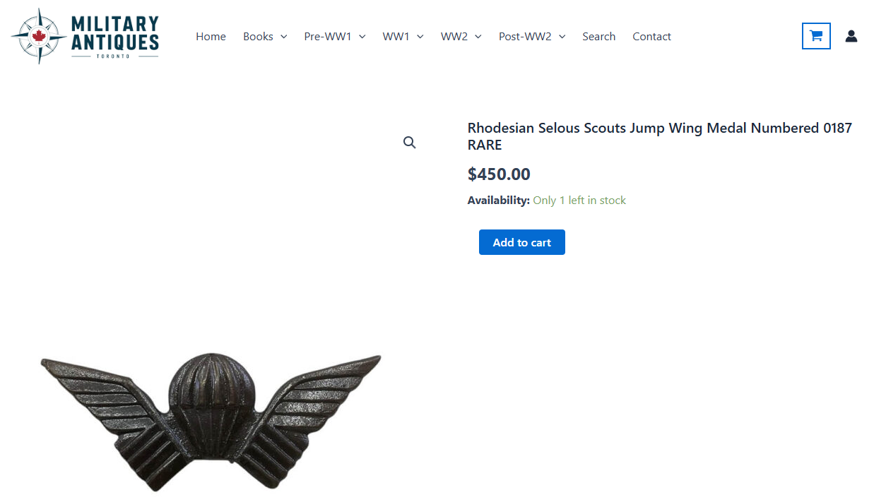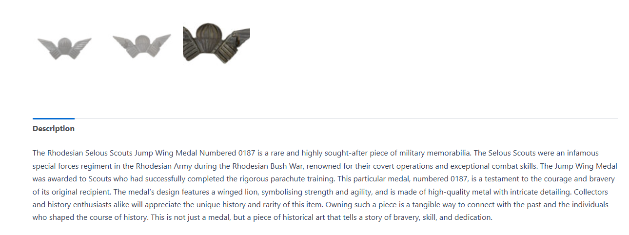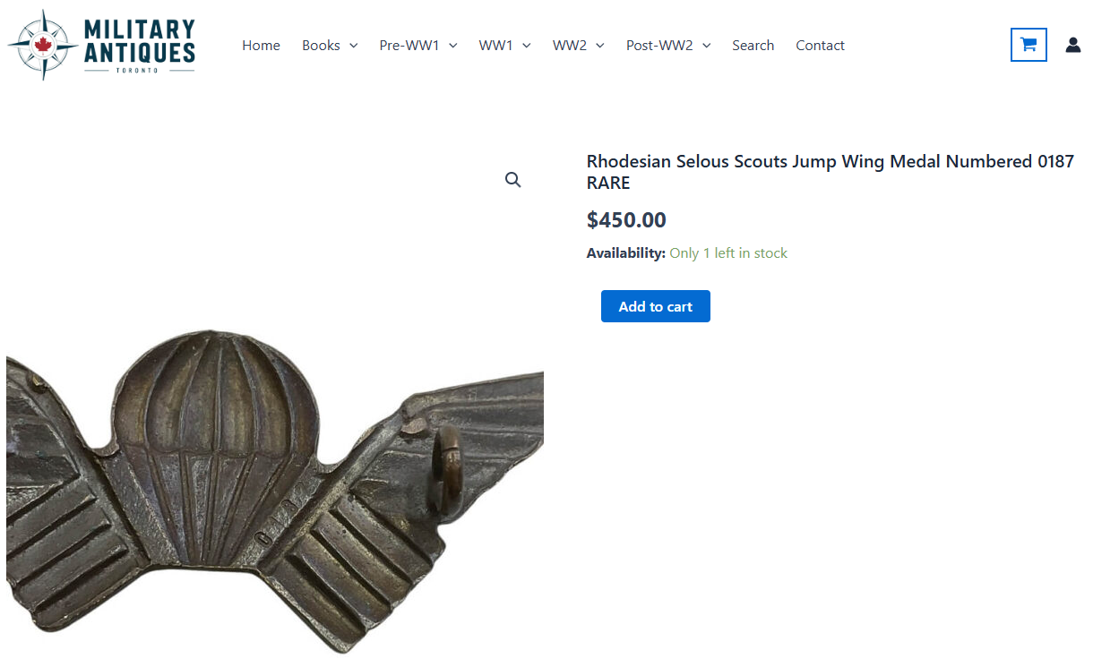 Listed for sale by Military Antiques in Toronto as a genuine Selous Scouts issued paratrooper wing.